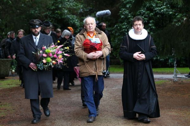 Domincas Urne ist herzförmig. Geziert mit einer roten Schleife. Anmutig, ebenmäßig und sehr schön. Original Grabstein von Domenica Niehoff Am Tag der Beisetzung: Fotograf Günter Zint (Mitte) trägt die Urne mit der Asche von Domenica