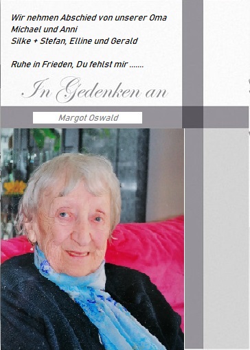 95 years Margot Oswald (née Köckritz)04.09.1926 - 03.05.2022 [1.569 visitors]